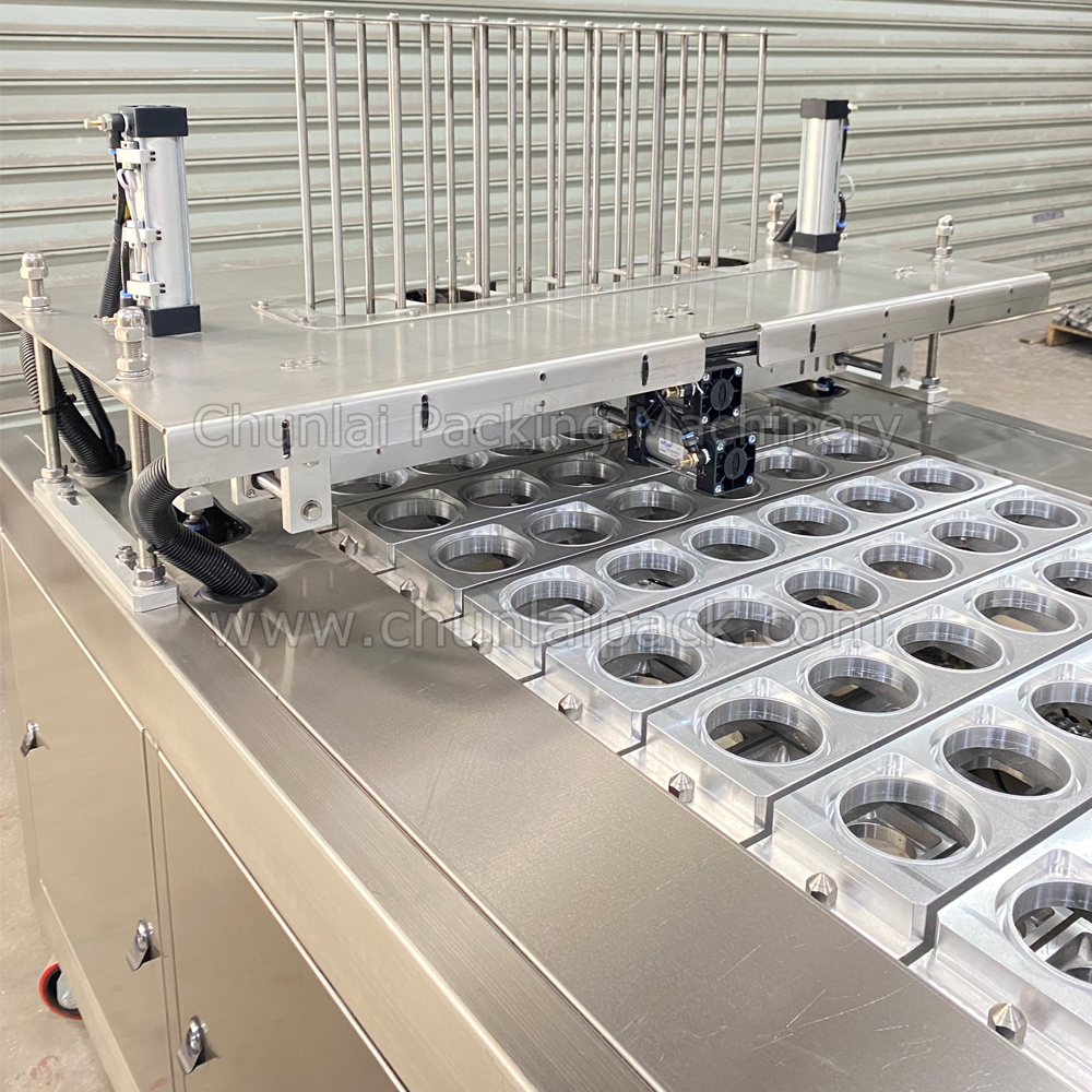 Aluminum foil lids placing function: it make up by 180 rotate vacuum sucker and lids magazine, it can place the lid on the mold fast and accurately.
