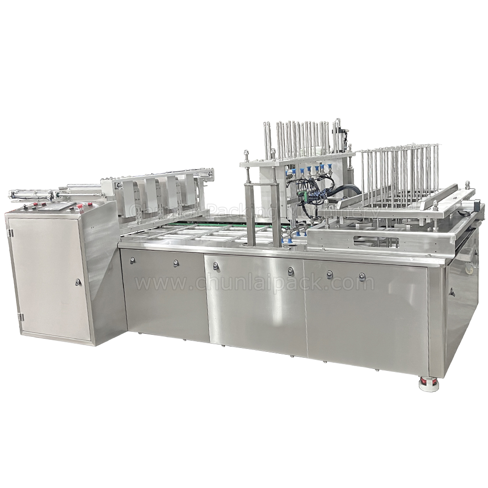 The machine is customized for insertion moisture absorbent pads for trays which can pack meat, fruits, or seafood, maintaining their freshness. These are the pads used to absorb the unwanted liquid from the meat, fruit or seafood.