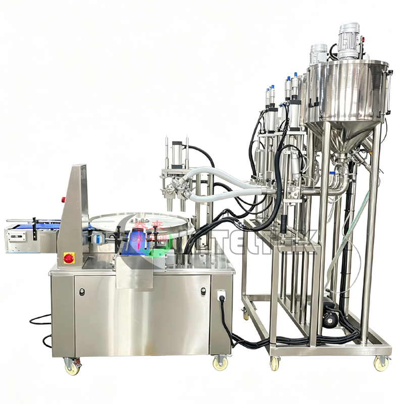 Cups, jars, or trays are automatically positioned under the filling heads.