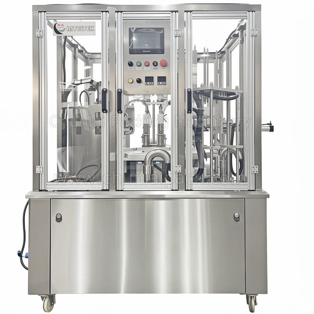 Chunlai's KIS-900 Automatic Rotary Type Salad Cup Filling Sealing Capping Machine is a compact and versatile packaging solution designed for automatic filling, sealing, and capping of salad cups and a wide range of food products including hummus, dipping sauces, yogurt, desserts, and ready-to-eat meals. Built with a rotary indexing system, this machine efficiently completes the full process of cup denesting, precise filling, heat sealing, optional vacuum, capping, and automatic discharge, ensuring hygienic and consistent packaging. It supports multiple product types such as liquids, pastes, granules, and powders by integrating different filling systems like gravity fillers, piston fillers, auger fillers, or volumetric dosing units.