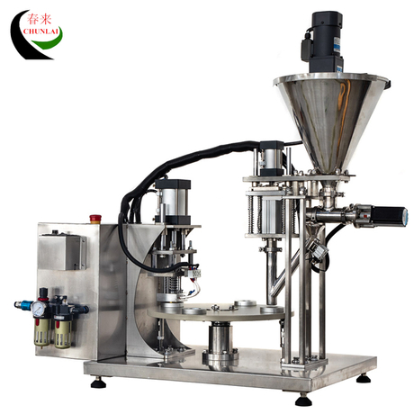 MS-1 Semi Automatic Rotary Type Coffee Capsule Filling Sealing Machine with manual drive without filling station. The cup sealer is characterized by compact design and a small capacity, which is about 300-400 cups/hour. Machine is made with a rotating table, filling, pre-cut aluminum lid applying station, sealing station.